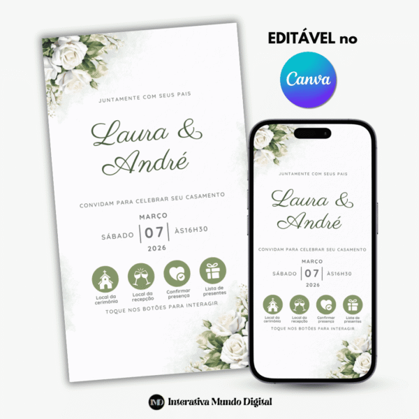 Convite Interativo de Casamento Verde da Interativa Mundo Digital une praticidade, modernidade e sofisticação em um único produto. Nosso modelo é totalmente editável no Canva gratuito, permitindo personalizar cores, fontes, textos e elementos visuais conforme o estilo da celebração. Dessa forma, cada convite transmite emoção, exclusividade e o charme que o momento merece.