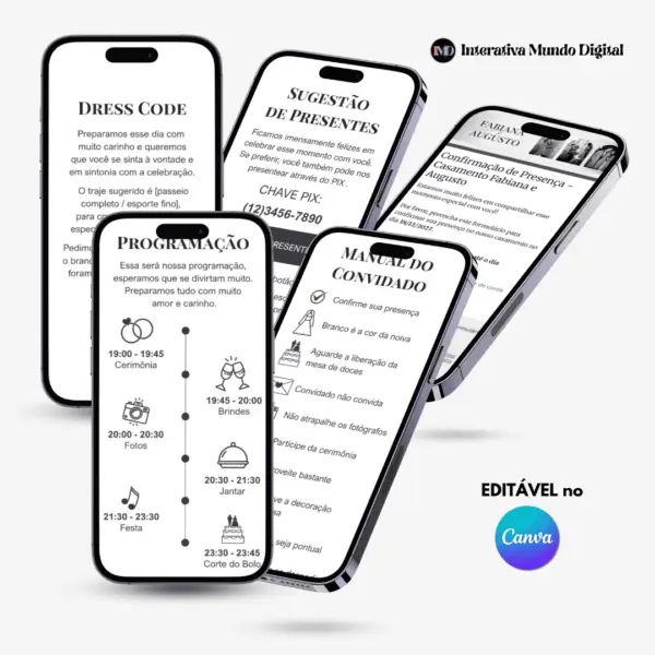 - Páginas adicionais (programação, manual do convidado, dress code e sugestão de presentes)